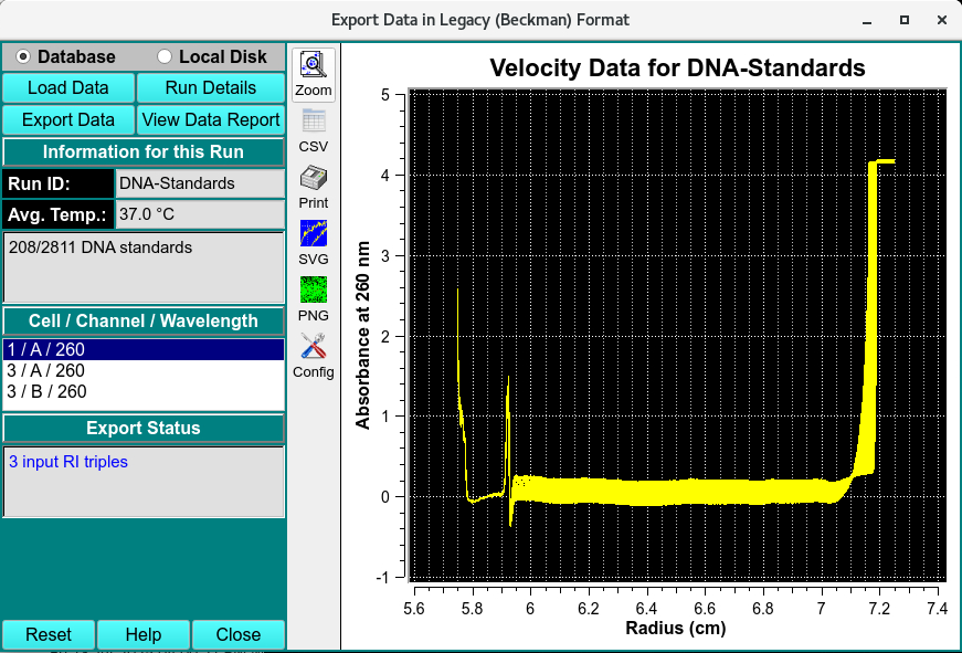 This module enables you to load a run with one or more triplicates in UltraScan III format (.auc) and export the data to files in legacy (Beckman) format.