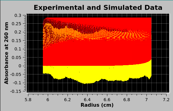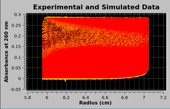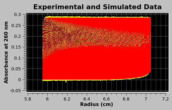 Upon completion of simulation computations the plot of experimental data (in yellow and cyan) is overlaid in the main window lower plot with the simulation data (in red), as shown in the image below. |