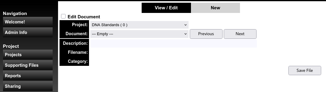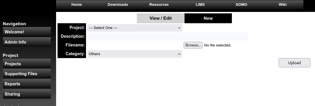 Using this window and in the database “Project” tab accessible after you log in, you can add new project by describing the goals, experimental design and sample components of the project or editing an existing project.