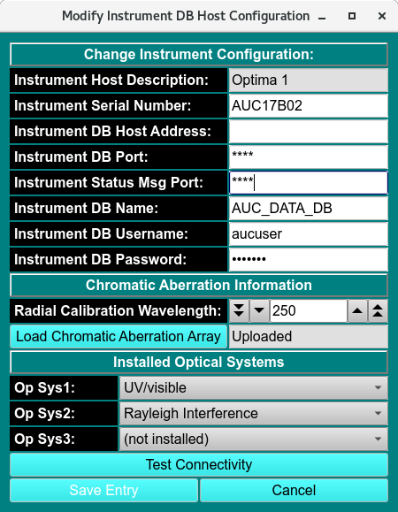 The optima host configuration panel allows you to configure the connection to one or more Optima instruments in your lab. Here you can enter the description, host address and port of the Optima instrument, as well as Optima database name, user name, and password. Additional information includes a radial calibration wavelength, a file from which to upload a chromatic aberration array, and installed optical systems.