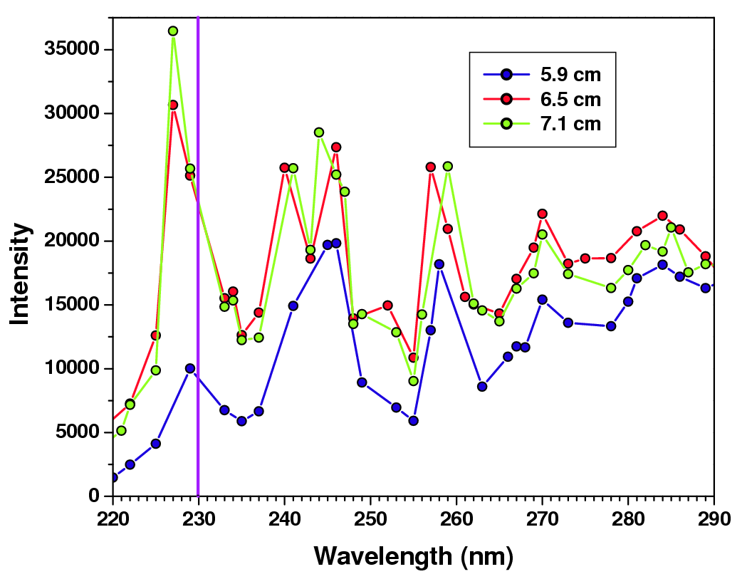 The intensity variation effect may be less in the visible range. In fact, in this particular example the 5.9 position provides higher intensity in the visible, but much lower intensity in the UV. Another issue with this data is the clear discrepancy of the 230 peak. Not only do the intensities vary greatly for different radial positions, but also, the position of the 230 peak varies between radial positions, and has "moved" to 227 nm. Clearly, the wavelength calibration is off, and there is some monochromator flaw that allows the wavelength to shift between scans. This is not desirable, especially in the 230 nm range since it falls on the shoulder of an absorbance peak.