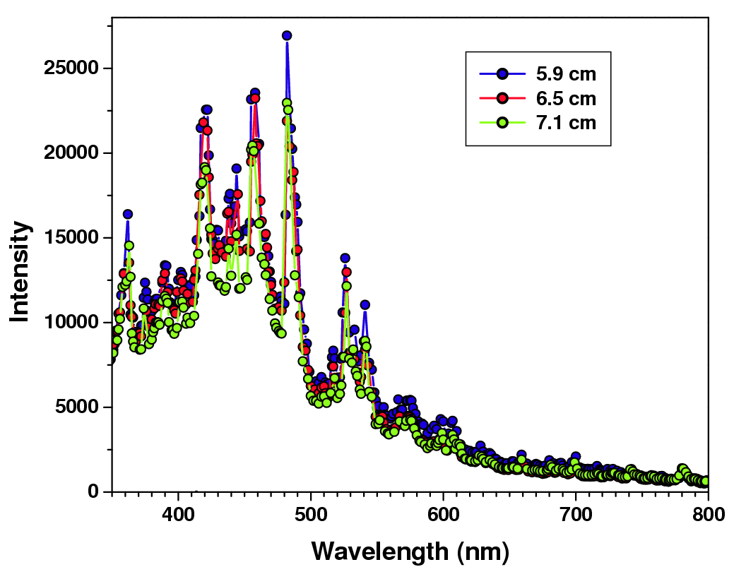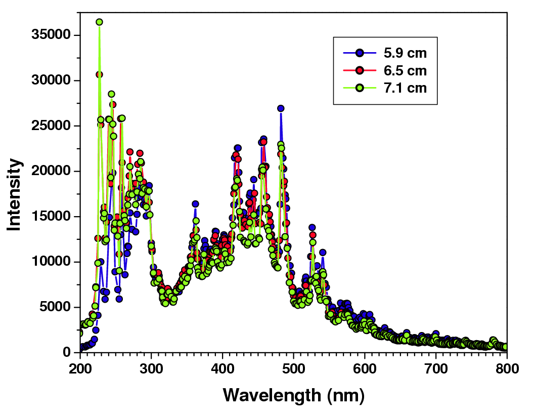 Optical system Flaws: Here is an example for an optical system that shows markedly different intensities in the UV range. Another issue here is the variation in the position of most peaks. They should not shift around as much, which is a sign of a faulty monochromator. Exchange the monochromator to see if the problem is related to it. The variation in intensity can be caused by dirt in the optical path, most often it is oil from the diffusion pump that has accumulated on the various optical components and now obliterates the path, most notably in the UV. Another issue may be lack of proper alignment of the lamp. Rotate the lamp by a few degrees inside its housing to find the "sweet spot" where intensity is most consistent and highest for all wavelengths and positions in the cell. This takes some experimentation to determine.